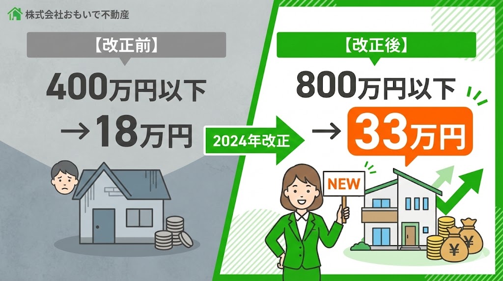 これまでは「400万円以下の物件」に対してのみ、特例(最大18万円+税)が認められていました。